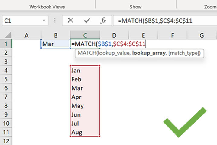 In our case, lookup value is C2 cell, which is "Jan", this will be looked in the range B5:H5. match_type is zero, so it is the exact match. The MATCH function will deliver the relative position of "Jan", which is 2. This will be used as input for col_index_num in VLOOKUP function.