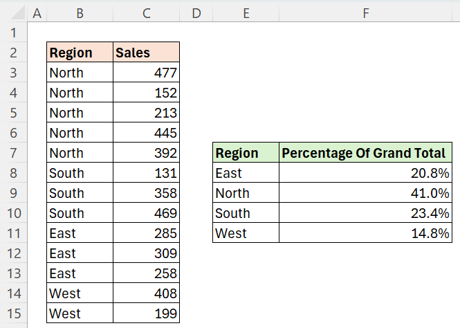 Our objective is to calculate the Percentage of the Grand Total for each region.